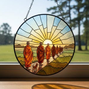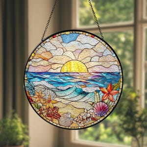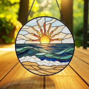 Ocean Wave Sunrise Stained Glass Suncatcher, Coastal Beach Round Window Hanging Decor, Sea Sun Catcher Gift for Ocean Lovers